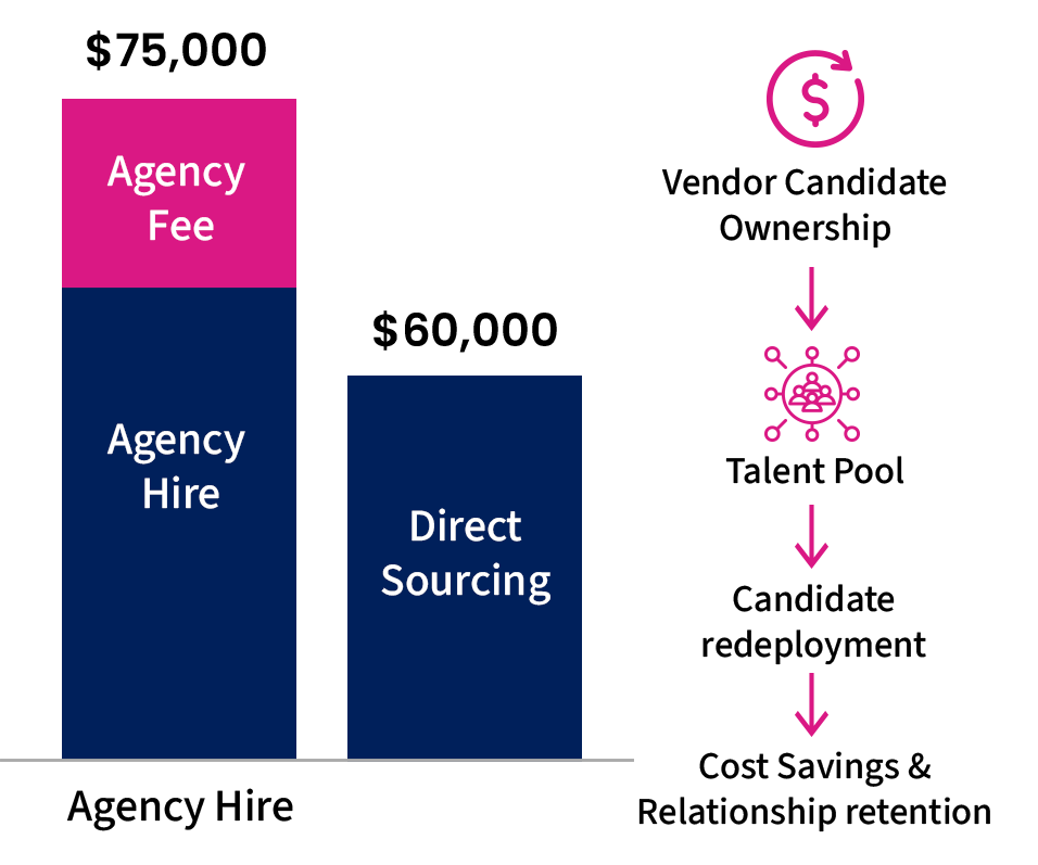 Direct sourcing helps organizations minimize duplicate costs, while building lasting relationships, reducing costs, and streamlining temp-to-perm conversions. By helping organizations create and nurture their own talent communities, direct sourcing empowers organizations to take control of the candidate relationship, eliminating the “ownership” fees associated with vendors.