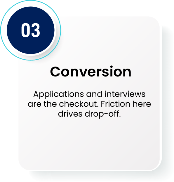 SEO-driven content and role-specific landing pages meet talent early during curiosity—when they’re researching skills, paths, and employers—pulling them into your ecosystem long before they’re ready to apply.