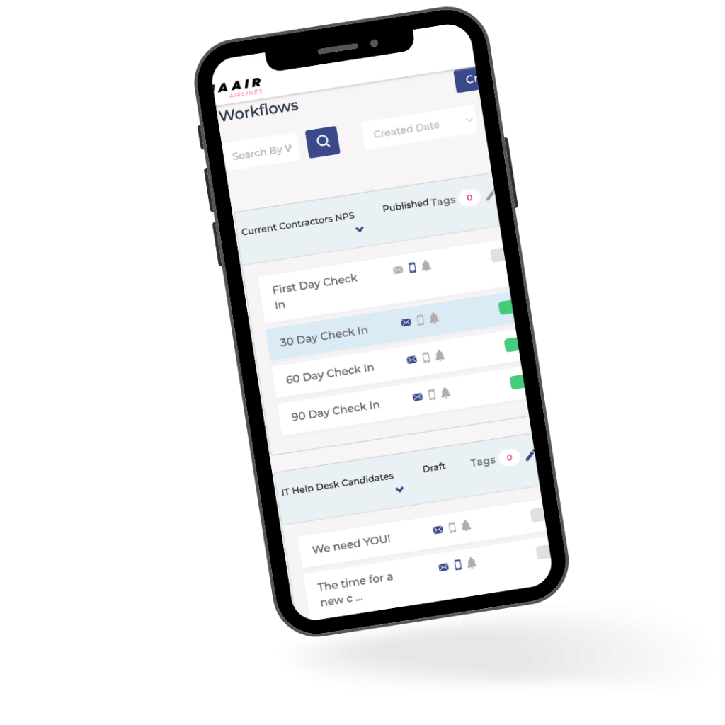 Say goodbye to the guesswork in candidate engagement. WorkLLama’s AI-driven platform streamlines the process with a What/Whom/When/How approach, allowing you to build workflows with various automated touchpoints. Each touchpoint is tailored to deliver What (content, message, survey, bot interaction) to Whom (specific talent communities), When (start day, redeployment, credential expiration), and How (via SMS, email, and push). Engage candidates effortlessly and at the right moment.